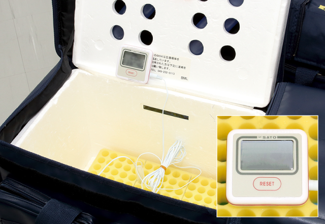 コースの出発・中間・帰社時に温度を測定、記録し徹底管理することで、お客様からお預かりした検体を最適の状態で検査に入ることが出来ます。
