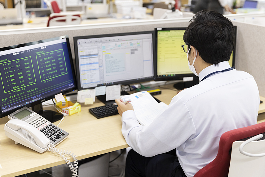 主にPCでデータ入力、電話対応をしています。他部署への伝達も多いので、